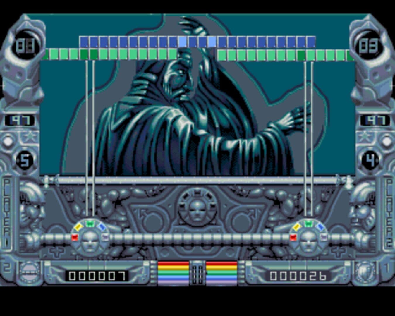 ital Light is one of those innovative games which only appear once a while. In this particular one, you have to control a small paint gun that contains five different colored paints, and destroy blocks that are falling toward you by making them all the same color. Your paint gun is on a roller at the bottom of the screen, and horizontal strips of colored blocks fall from the top of the screen at varying speeds. Holding down the fire button and pushing left or right changes the currently selected color, and sometimes you only just have enough time to get the right color before the blocks smash into you. As the blocks fall at varying speeds, there are times when an avalanche is set off by a slow block being hit by a fast moving block above it. This is a game that gets very, very frantic.