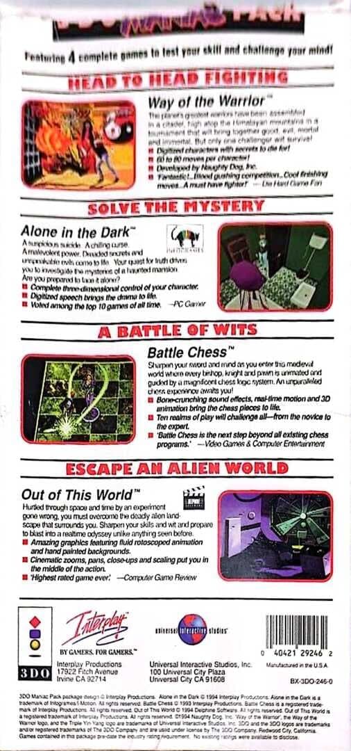 This is a four-game compilation pack that contains the following 3DO games: Alone In The Dark Battle Chess Out Of This World Way Of The Warrior