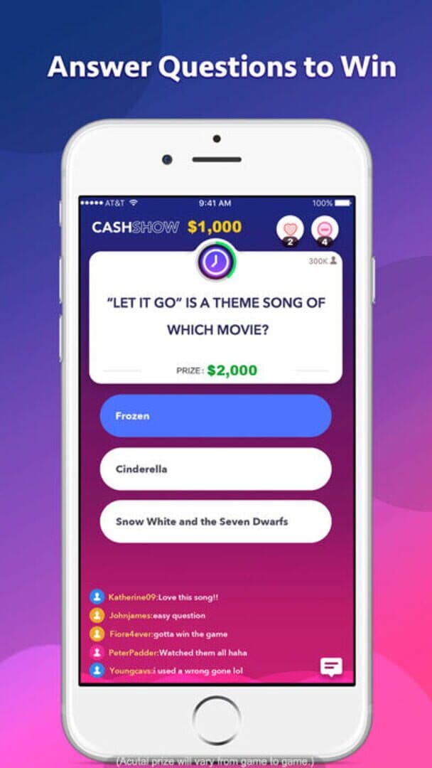 Cash Show is a live trivia show game with real money prizes! You just need to answer questions and you can win BIG MONEY! Enrich your mind and win big prizes with your knowledge! Daily Cash Shows! * Show opens three times a day at 3:30PM EDT (12:30PM PDT), 8:00PM EDT (5:00PM PDT) and 9:30PM EDT (6:30 PM PDT). * There are twelve multiple choice questions for every show, which cover topics like science, art, sports, entertainment and many more! * You will have ten seconds to answer each question. Once you reach prize questions, you can win REAL money from every question with a correct answer! Answer all prize questions right and you will win a big PRIZE! * If more than one player makes it to the end, they will split the prize. Otherwise, the winner will bring all the money home! Come and win BIG MONEY everyday! The Cash Show is ready! Show us what you got!