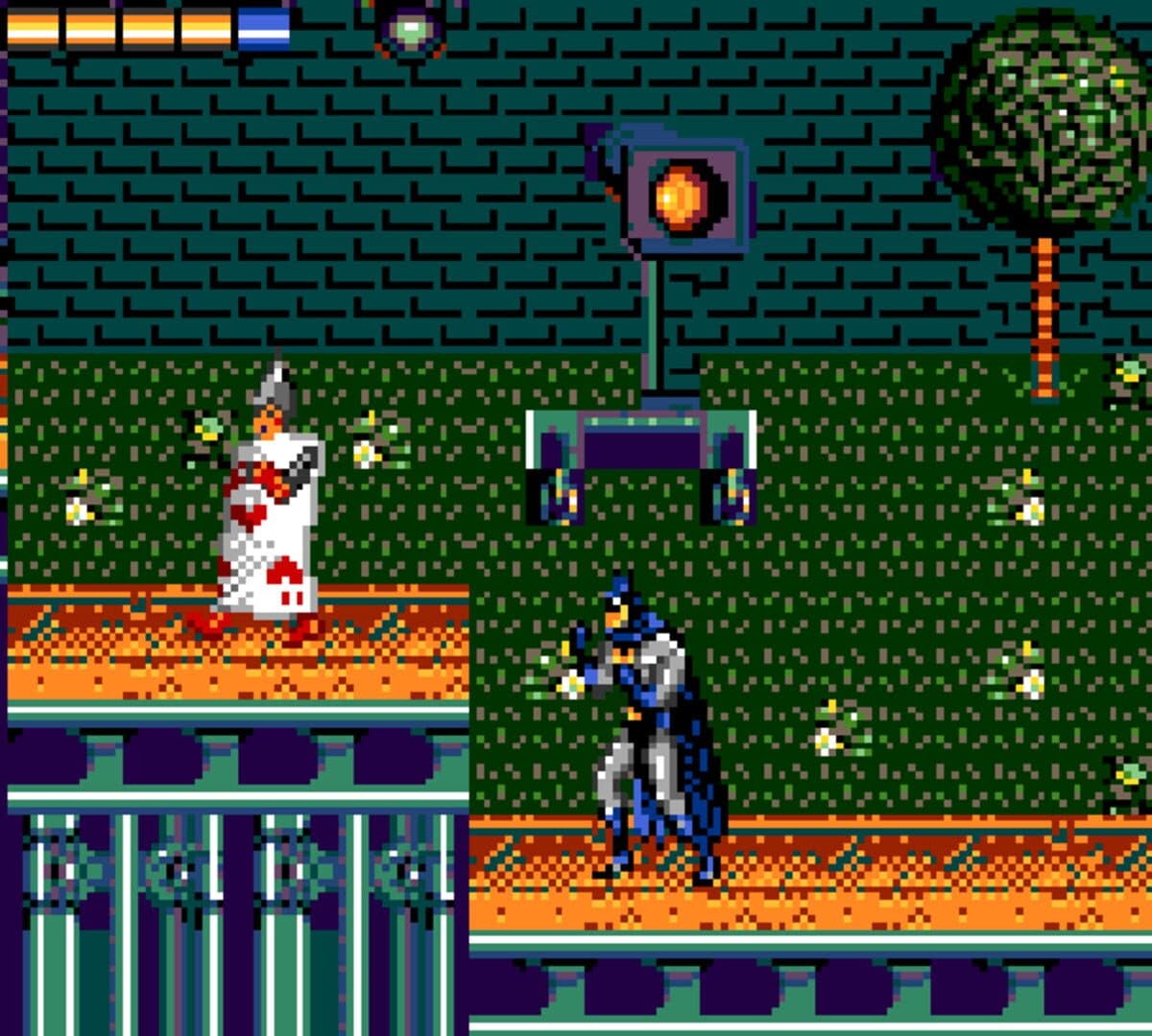 The Joker has assembled a gang of old Batman foes and kidnapped Robin, and the Batman has to go save him. There are four different levels, each with 2 or 3 stages, where Batman runs around beating up thugs and jumping between platforms before taking on a boss. Each stage ends with a boss encounter - some generic machine or thug in the early stages, and a classic Batman villain at the final stage of the level. The four levels takes Batman through a theater where he takes on the Mad Hatter, a frozen office building where he takes on Mr. Freeze, a graveyard where he takes on the Scarecrow, and finally an amusement park where he takes on Harley and the Joker. Batman typically fights with projectile attacks - he has an unlimited supply of batarangs, but can pick up other weapons with limited ammunition in small item boxes along the way. They're all more powerful than the batarangs. Once Batman gets close to an enemy, he will switch to melee attacks, which deal more damage than the projectiles. Batman can make several types of jumps, both upwards and sideways. Pressing the jump button twice does a double jump. Batman starts out with 9 extra lives, and instantly respawns where he died after losing one, with a full health bar, all ammunition intact, and all inflicted damage and defeated enemies accounted for. There are also multiple extra lives and life bar refill items spread around on the stages. The game has infinite continues and a password system, allowing the player to start over from any previously reached stage.