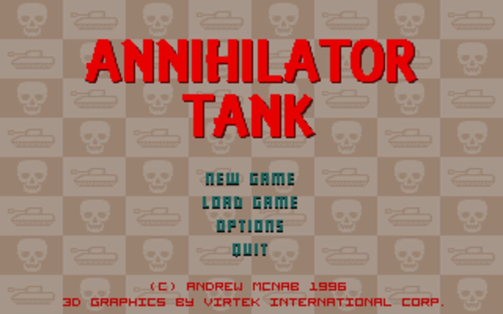 Annihilator Tank is a shareware game for DOS in which the player commands a tank and must destroy greater and greater numbers of enemy tanks in more complex situations. This culminates in the 'Combat Unlimited' level where the number of enemy tanks is unlimited and the player must destroy as many as possible before losing their only tank. The tank controls include the standard left/right forward/reverse and fire in addition to turret right, turret left and turret centre. The game screen features a small radar which shows the location of enemy targets, a compass for orientation, and a status bar. The actual game screen contains features such as trees which can be destroyed, so neither the player nor the enemy can hide behind them. The game has four save slots. The full game consists of four levels Country Carnage Wasteland Warriors Desert Destruction Combat Unlimited Only the Country Carnage level was included in the shareware release.