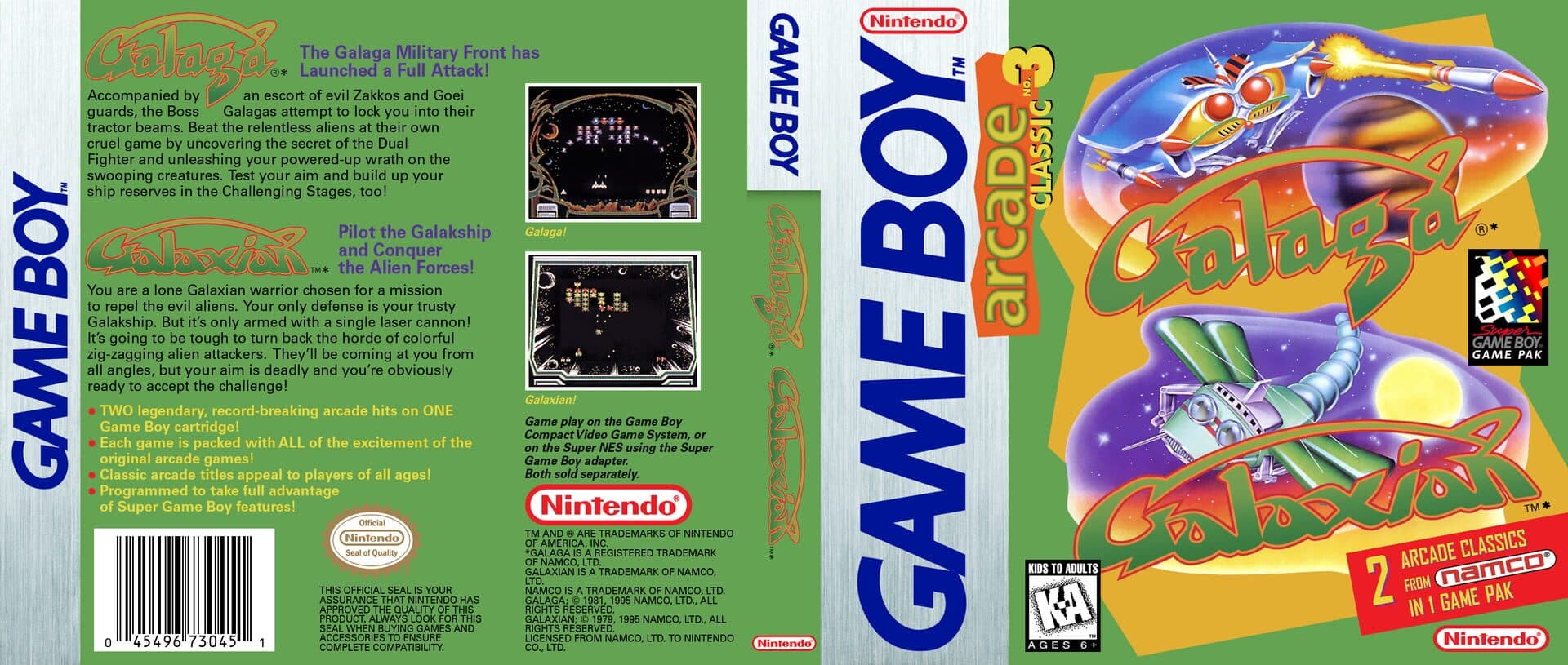 A compilation of two classic arcade titles, Galaga and Galaxian ported over to the Game Boy and features original gameplay features. It is also Super Game Boy compatible complete with background borders that replicate their original arcade machine casings.