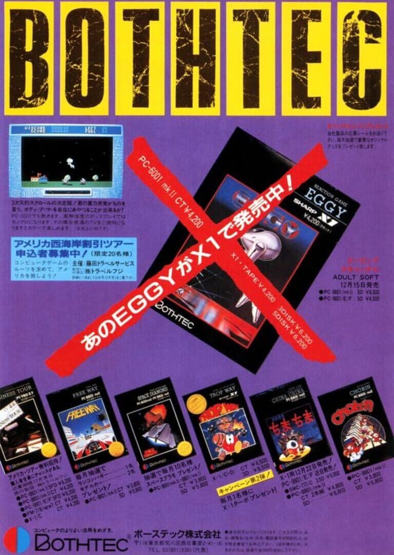 EGGY is an action game that won the Excellence Award at Bothtec's first programming contest and was inspired by Choplifter. In this game players take the role of Ena, a robot which has to collect goods that are dropped from the sky with parachutes. The robot has a limited fuel supply that decreases with time and every time the robot takes damage from the enemies. The fuel supply can be replenished by saving humans that were transformed into killer cyborgs. The robot can only shoot diagonally after jumping and the location of the enemies, as well as the goods are indicated on a small map in the bottom. To complete each level, players need to collect a set amount of goods indicated at the top-right part of the screen.