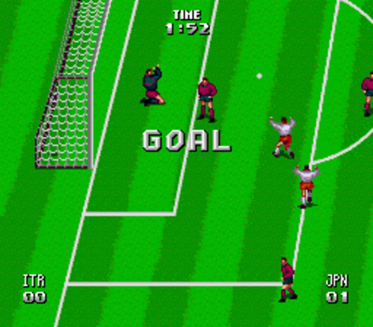 Tecmo World Cup Super Soccer is quite different from the similarly-named Tecmo World Cup Soccer. In this football (soccer) game players can choose between competing for the World Cup or participating in the Japanese league tournament. Only eight international teams (Brazil, Argentine, Japan, England, France, Spain, Italy, and Germany) are available. Before a match begins players can choose between three general strategies for the team - normal, offensive, or defensive. Weather conditions (normal, rain, or snow) and match length can be selected as well. The game itself is played from a third-person perspective that slightly switches between isometric and top-down depending on the situation.