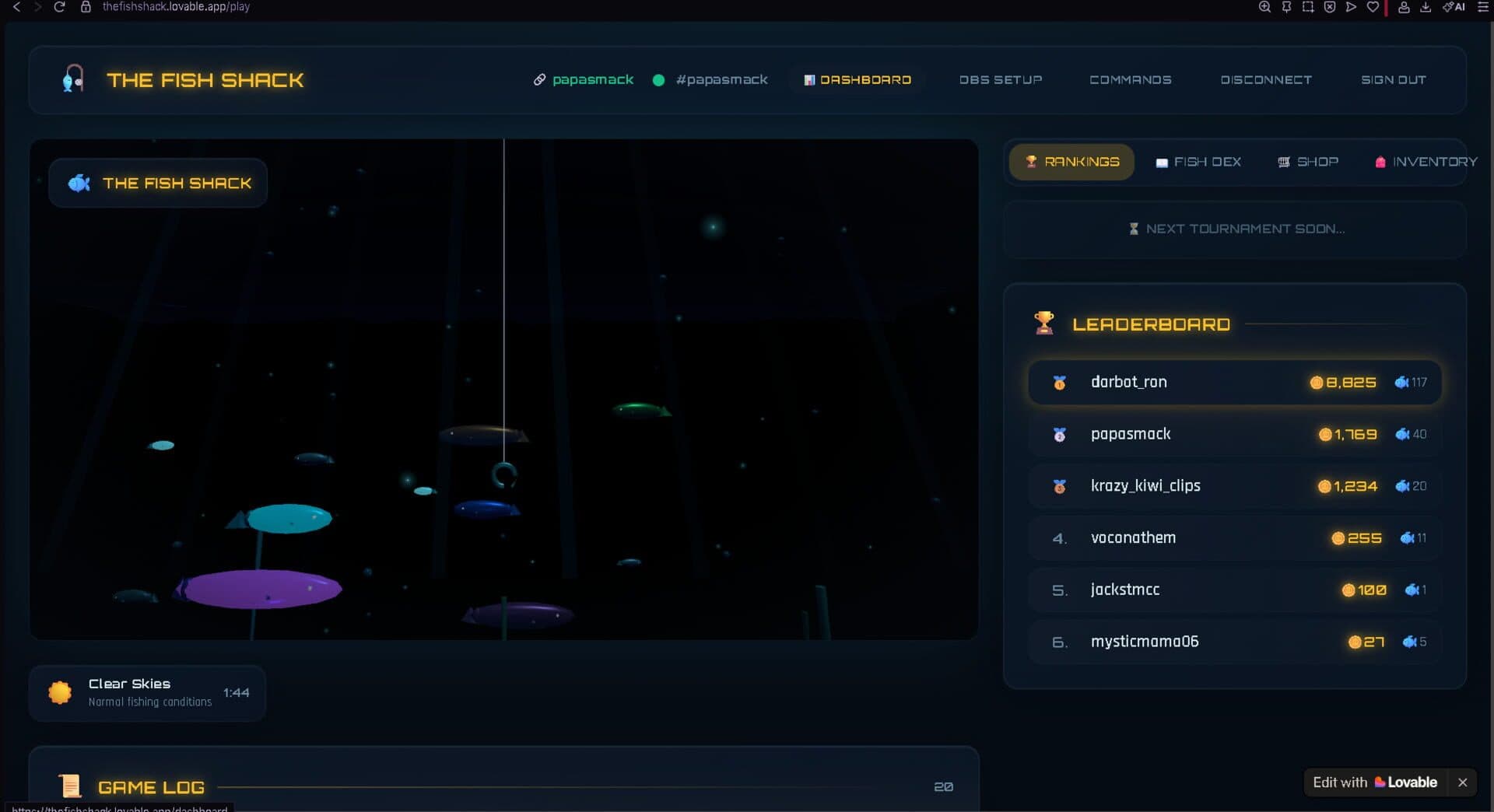 A fun, free browser-based fishing game designed for Twitch streamers and their viewers. Viewers can join the stream’s fishing pond directly through chat commands — no downloads, no sign-ups, completely free. Cast your line, catch fish, and climb the leaderboard in real-time alongside other viewers.