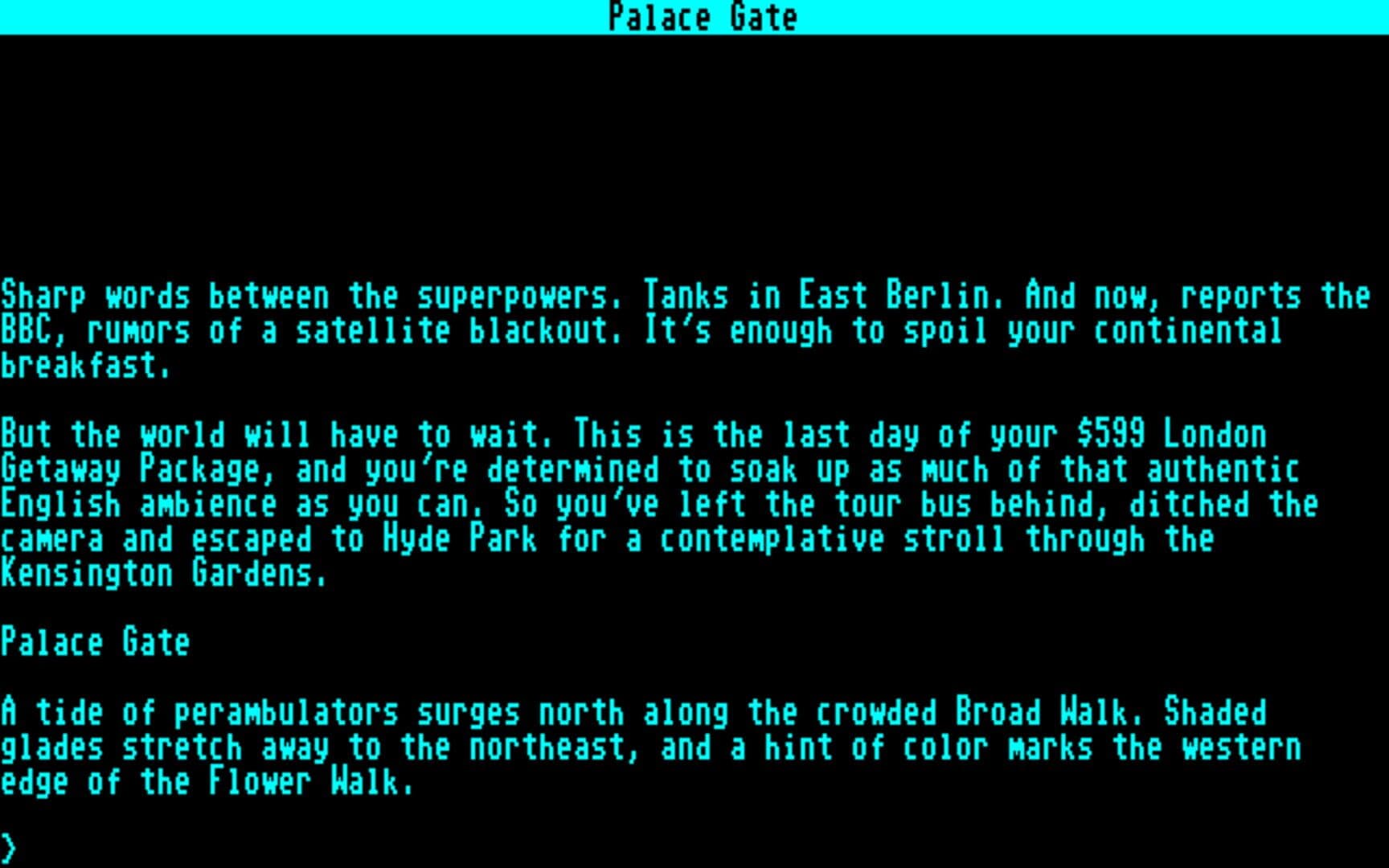 You're neither an adventurer nor a professional thrill-seeker. You're simply an American tourist in London, enjoying a relaxing stroll through the famous Kensington Gardens. When World War III starts and the city is vaporized moments after the story begins, you have no hope of survival. Unless you enter another time, another place, another dimension. Escaping the destruction of London is not the end of your problems, but rather the beginning of new, more bizarre riddles. You'll find yourself in an exotic world teeming with giant fly traps, strange creatures, and other inconveniences. Time and space will behave with their own intricate and mischievous logic. You'll visit fantastic places and acquire curious objects as you seek to discover the logic behind your newfound universe. And if you can figure out the patter of events, you'll wind up in the New Mexico desert, minutes before the culmination of the greatest scientific experiment of all time: the world's first atomic explosion, code-named Trinity.