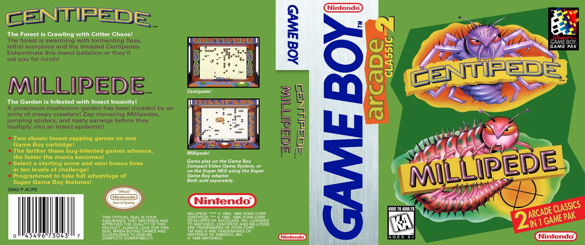 A compilation of two classic games, Centipede and Millipede ported over to the Game Boy system with original gameplay. It is also compatible with the Super Game Boy Adapter with backgrounds made to resemble their original arcade casings.
