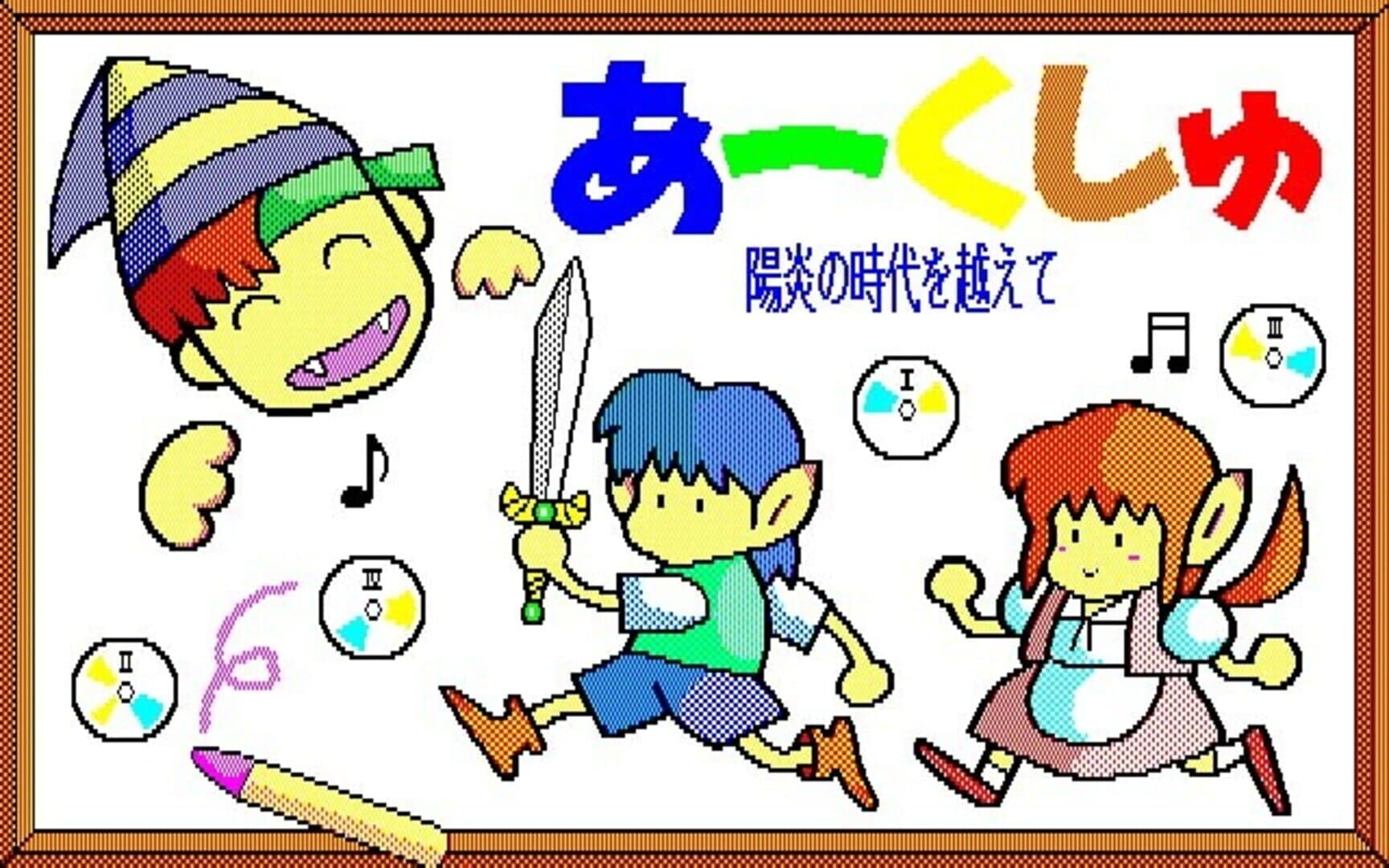 Arcshu: Kagerou no Jidai o Koete is loosely related to the greater Arcus series. It is a visual novel created in the parody style, and in the process hits many common pop culture items of the day (movies, novels, comics, animation, etc.). The story follows the main character, Jeda, through a series of still images and standard adventure-game puzzles and menu-based navigation as the player works through an overlaying mystery. As the story progresses, Jeda finds that there is a hole in his dimension, and the only way to repair this hole is to travel through other dimensions (and time) to seek out a mystical holy sword and a group of CDs that will restore things to their proper nature. Throughout this journey, there are numerous cameos and other appearances by other Wolf Team and Nippon Telenet characters from various other media (The Valis Series, Midgarts, Final Zone, etc.). Musically, there are also numerous tracks that have been pulled from these same properties (and in some cases comically rearranged) and are used to good effect here.