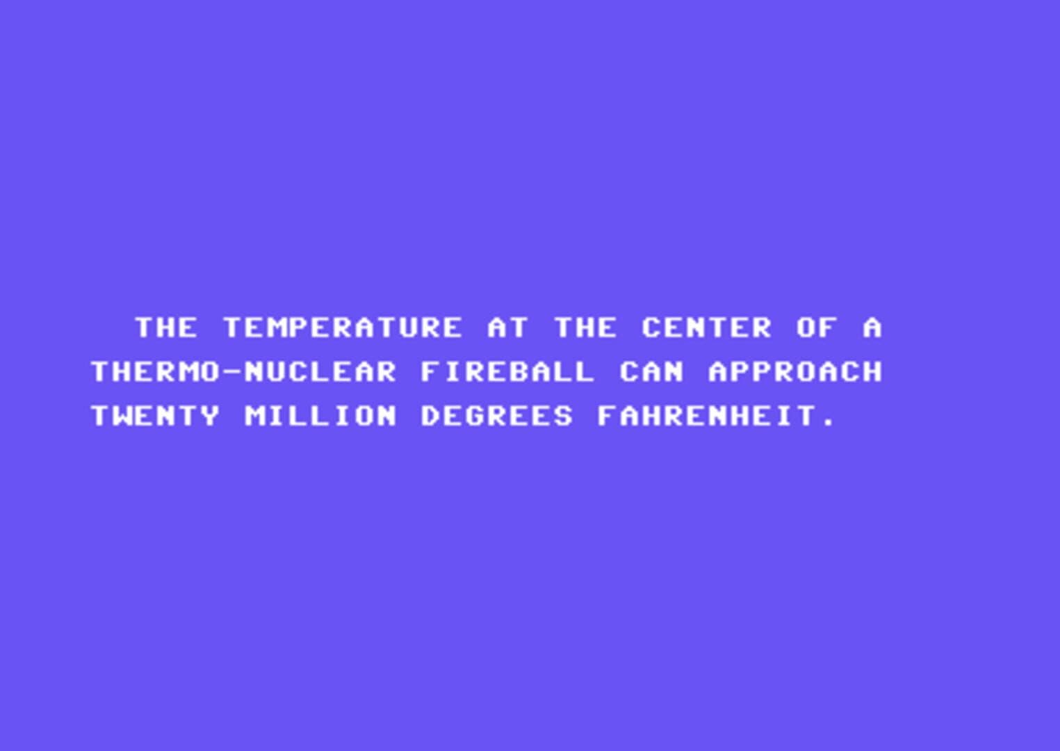 A graphical text-adventure game designed by Bob Blauschild in which the player has to save the world's five largest cities from being destroyed with thermal nuclear weapons.