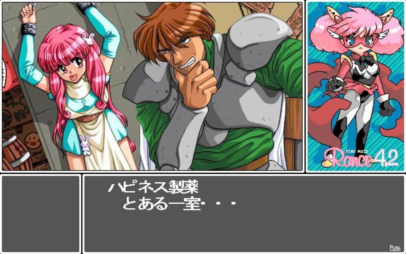 Rance 4.1 and Rance 4.2 are two parts of the same storyline, and use the same mechanics and artstyle. Part of the game involves navigating the Happiness Pharmaceutical office and Romance Park, speaking with people, and investigating the surroundings through an adventure game menu. The other part is a dungeon-crawler taking place in the Angel Army secret underground base. Within the base, there are specific rooms where the player can interact with the environment, use healing items, and load/save. The rooms are connected to each other by thin routes, where the only available actions are "Advance" and "Retreat", to take a step forwards or backward. (Most routes are about 3-5 steps long). These paths are the spots where random encounters can occur. When the game starts, the base is unmapped, and paths are marked on menus as "???". Each time the player crosses a path and enters a new room, Athena 2.0 will draw the room on the map (with a short dialogue among the party Rance about how to name and illustrate it; sometimes giving comical or non-indicative names). If Athena is not present, Rance will try to draw the map himself. The "???" option will change to reflect the room name. Some paths are hidden or trapped, and can only be crossed later in the game.