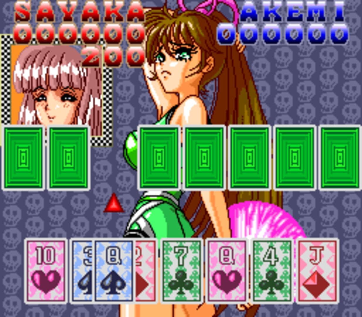 Cardangels is a card game in which the player takes the roles of the three friends, playing cards against young, attractive female opponents. Four types of card games are available: poker, blackjack, speed, and babanuki (a variant of old maid). A slot machine-like introduction determines which games are played against which opponents. The player can select the amount of rounds (minimum ten) needed to win a game and advance to the next opponent. The "free play" mode allows the player to choose the type of game actively, but the amount of available opponents is lower. There is no gambling in any of the games; points are awarded for combinations in poker and blackjack. The opponents undress after losing a game; however, they retain their underwear - there is no explicit nudity in the game.