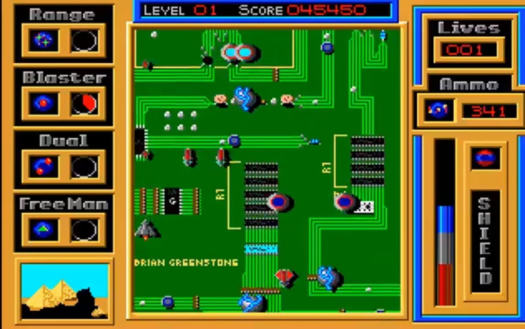 Cosmocade: The Arcade of Tomorrow contains 2 separate arcade games for the Apple IIgs. - Journey to Calibus: The player controls a small spaceship that can move in all directions, and fires directly forward. As alien ships are destroyed, they drop a number of power ups. Some of these power-ups contain maps which fill in the screen in the bottom left, allowing the player to advance to the next level when completely filled. The goal is to return to Earth, and there are 10 levels in total. The player starts with 5 lives, and it's game over when all are lost. - Naxos: Played from a first person perspective, the player must shoot alien creatures as they appear on the screen. If the aliens are allowed to shoot, the player takes damage. The player has limited ammo, and must continually reload. The player has a health bar, and when all health is depleted, it's game over.