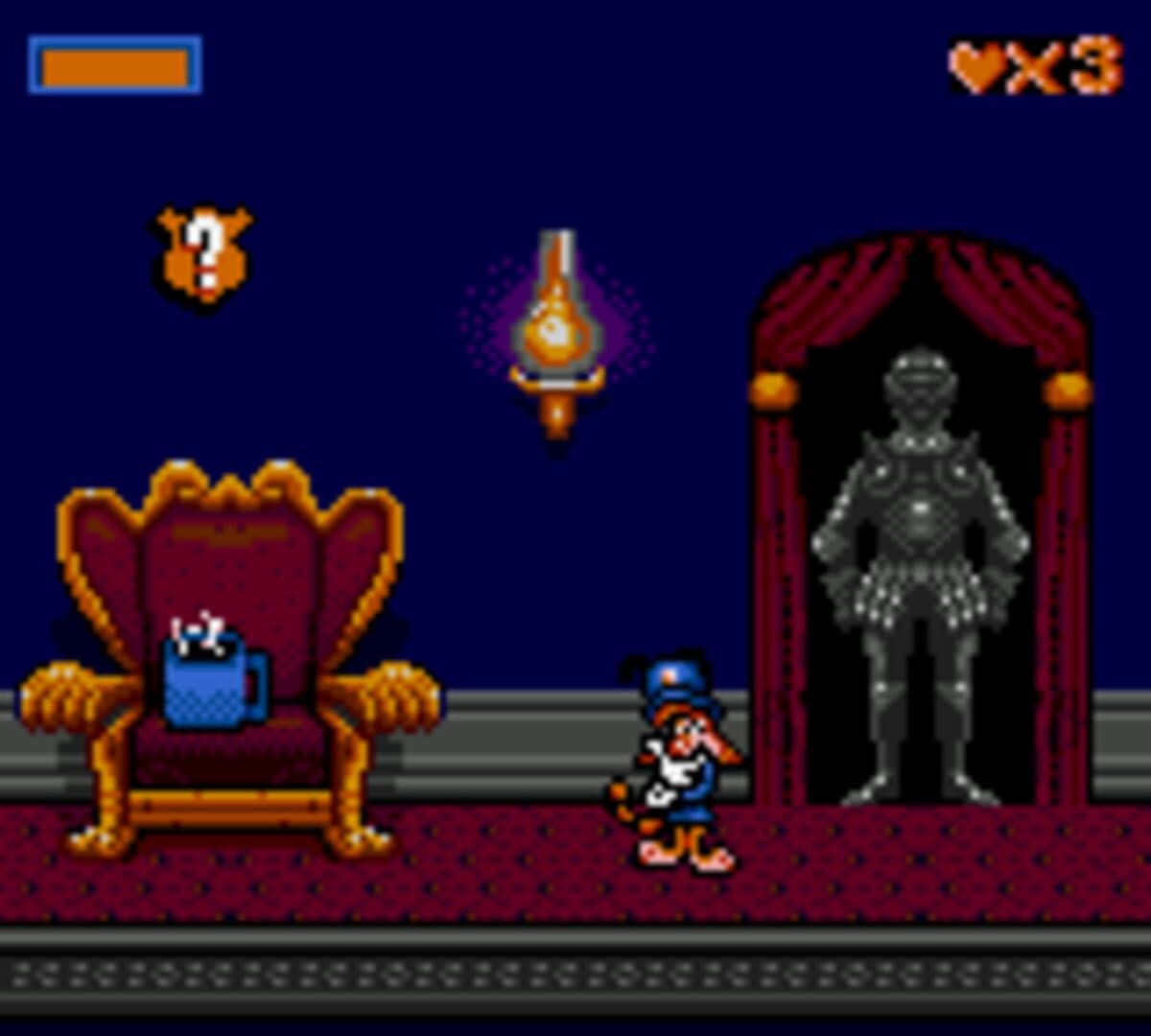 In this platform game, the player controls Bonkers through several levels where he must find 7 pickle clues. By pressing the pause button, a compass is shown, with the number of remaining clues and the direction of the next one. Bonkers can run (by holding button 1), jump (button 2) , duck and slide (by running and pressing the opposite direction on the d-pad). Bonkers will find several items to restore his health (like cups of coffee, donuts, slices of pizza and badges) as well as some bonus items. He'll also find some of his friends, like Marylin, who'll show him the way to bonus levels, where he must find pieces of the Toon Toaster. In these bonus levels, Bonkers will ride a mine cart in a rail course, trying to collect items.
