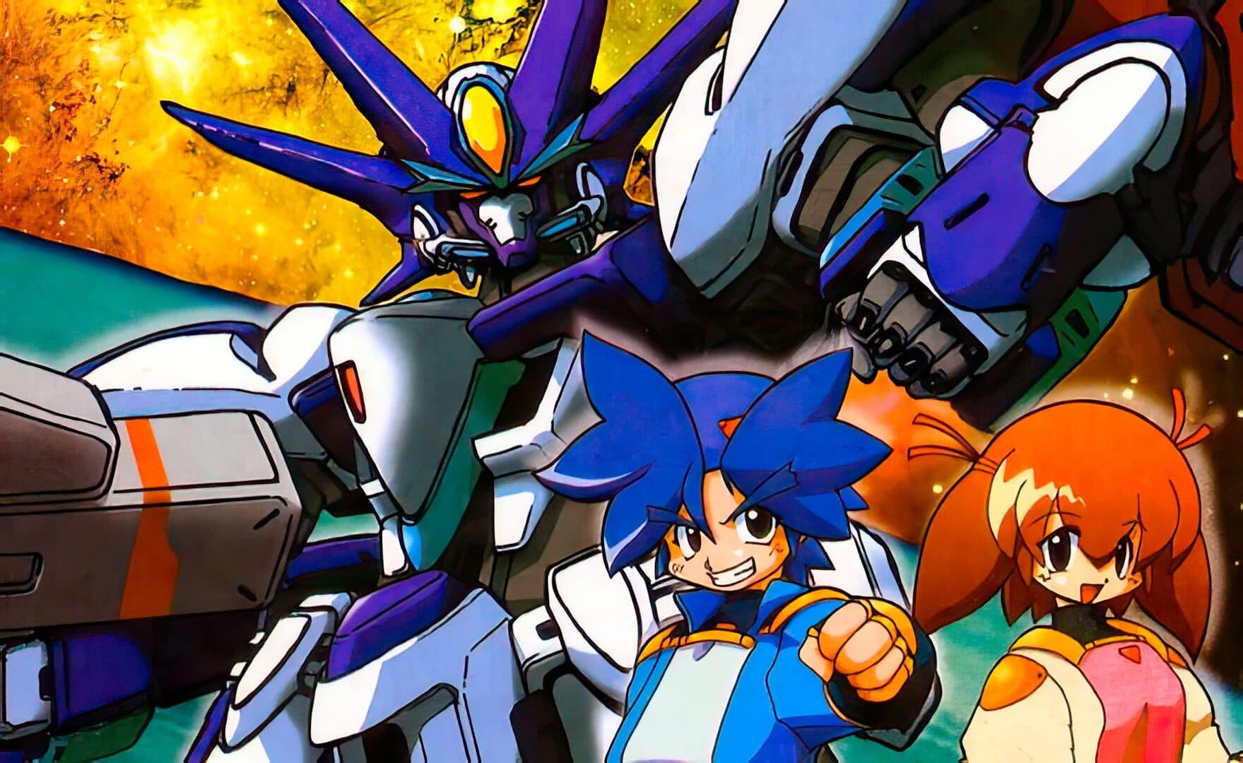 In Bakuretsu Muteki Bangai-O, a multi-directional shooter video game developed by Treasure, two young mech-pilots, Riki and his sister Mami share command of the powerful humanoid-shaped Bangai-O and battle villains from the "Cosmo Gang", guilty of fruit contraband, and lots of gun turrets, bombs and robots through 44 levels.