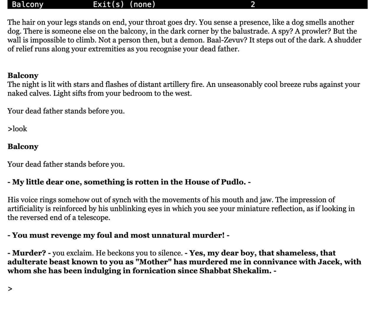 An interactive fiction interpretation of the Hamlet story, blended with Jewish culture and mysticism.