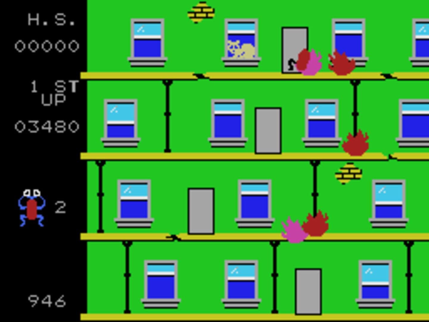 A tall building is on fire, and while all the human inhabitants seem to be safe, their cats are trapped in the flames. It is up to the brave fireman Frantic Freddy to save all the cats, floor by floor. Frantic Freddy is an arcade action game where Freddy must run back and forth on the ground, dodging falling rubbish while shooting water at flames in the windows of a building. When all fires are extinguished, the game progresses to the next floor, where Freddy can climb between the floors, shooting to the left and right instead of upwards. On these levels, there are two kinds of flames – the red and the purple ones. The purple ones are more aggressive, following Freddy around the screen, and can only be put out once all the red ones are extinguished. The game progresses in this way, alternating between the upwards-shooting levels and the sideways-shooting levels. On the higher difficulty levels, cats turn up at intervals in the windows, falling down after a while. Freddy must catch the cats, or he will lose a life. Similarly, he loses a life if hit by a fire or falling rubbish.