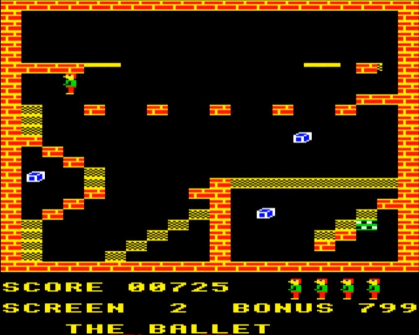 Karls Kavern is a platformer in the style of Manic Miner. It consists of thirty single screen levels where the objective in each is to simply collect all the boxes that lies scattered around. To make it the player has to jump between platforms (including moving ones) and avoid getting touched by any of the dangers that exist in the underground. Any contact will lead to a loss of life and so will a long fall. Part of the levels are also collapsing platforms and conveyor belts. The player has five lives and when they are all used up the game ends.