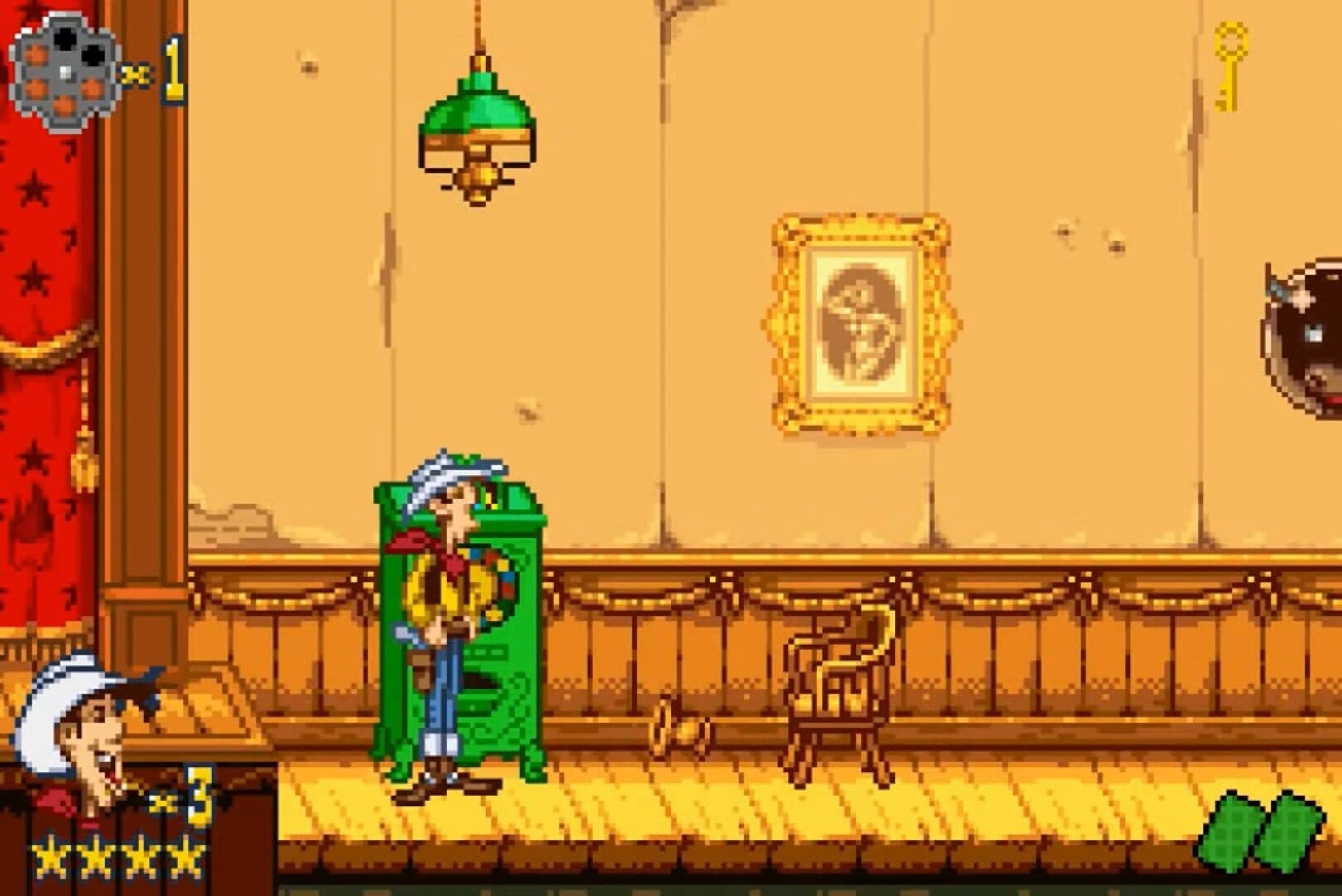 Based on the famous comics series about good cowboy Lucky Luke. Now the Daltons are let out from jail and robbed the bank, and you have to chase them shooting at the bad guys, collecting extra lives, ammunition and dynamites, and collecting the four aces to access the bonus level. Meeting with the dog Rintincan is a checkpoint. Characters of the game points you where to go next.