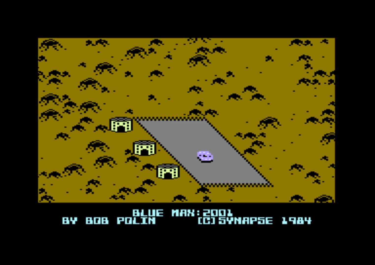 In this sequel to Synapse's Blue Max, it is the year 2001 and you are flying a flying saucer. You're trying to bomb enemy targets while not getting shot (or rammed) by enemy saucers or shot by ground cannon. If the screen border starts flashing yellow, you are dangerously close to the ground. If the border is red, you are hitting the ground. If the border is gray, you are flying low but not TOO low. If the border is light blue, then the enemy ship is a the same altitude as you.