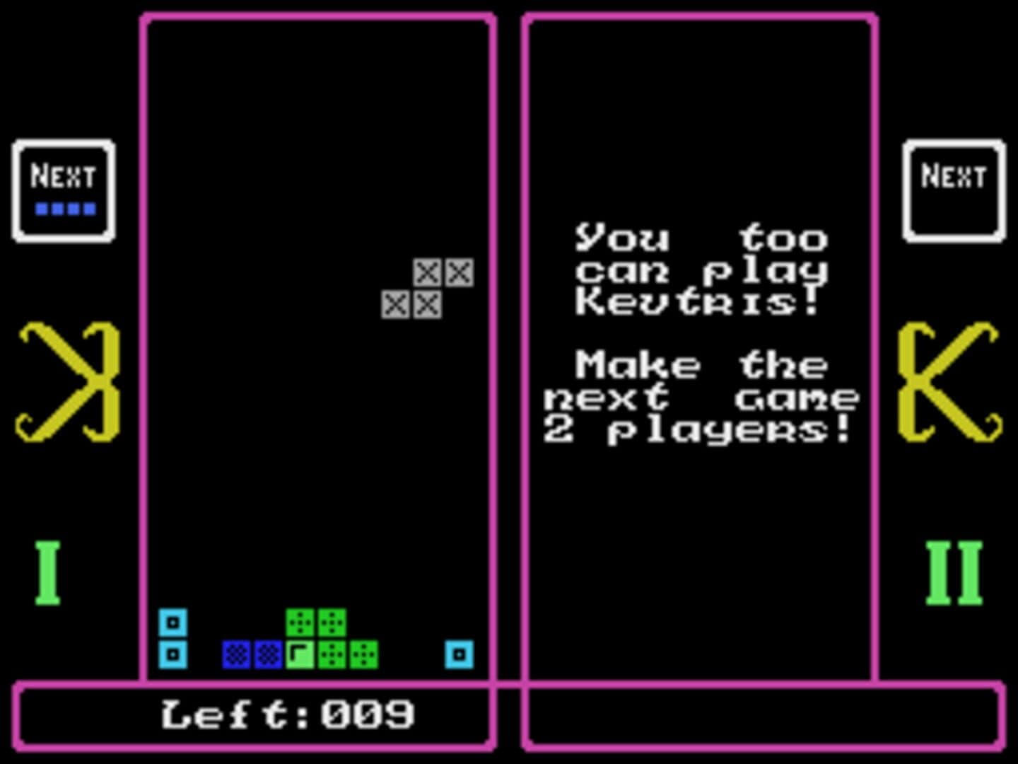 A Tetris clone for the ColecoVision. Despite being an early home-brew, Kevtris features both colourful graphics and background music, as well as three different game modes for both one and two players as well as handicaps. Apart from the normal Tetris game mode, there is the zero-out mode, where you have to clear a set number of lines to win a game, and the builder mode, where the blocks don't fall automatically, giving you all the time in the world to plan your moves.