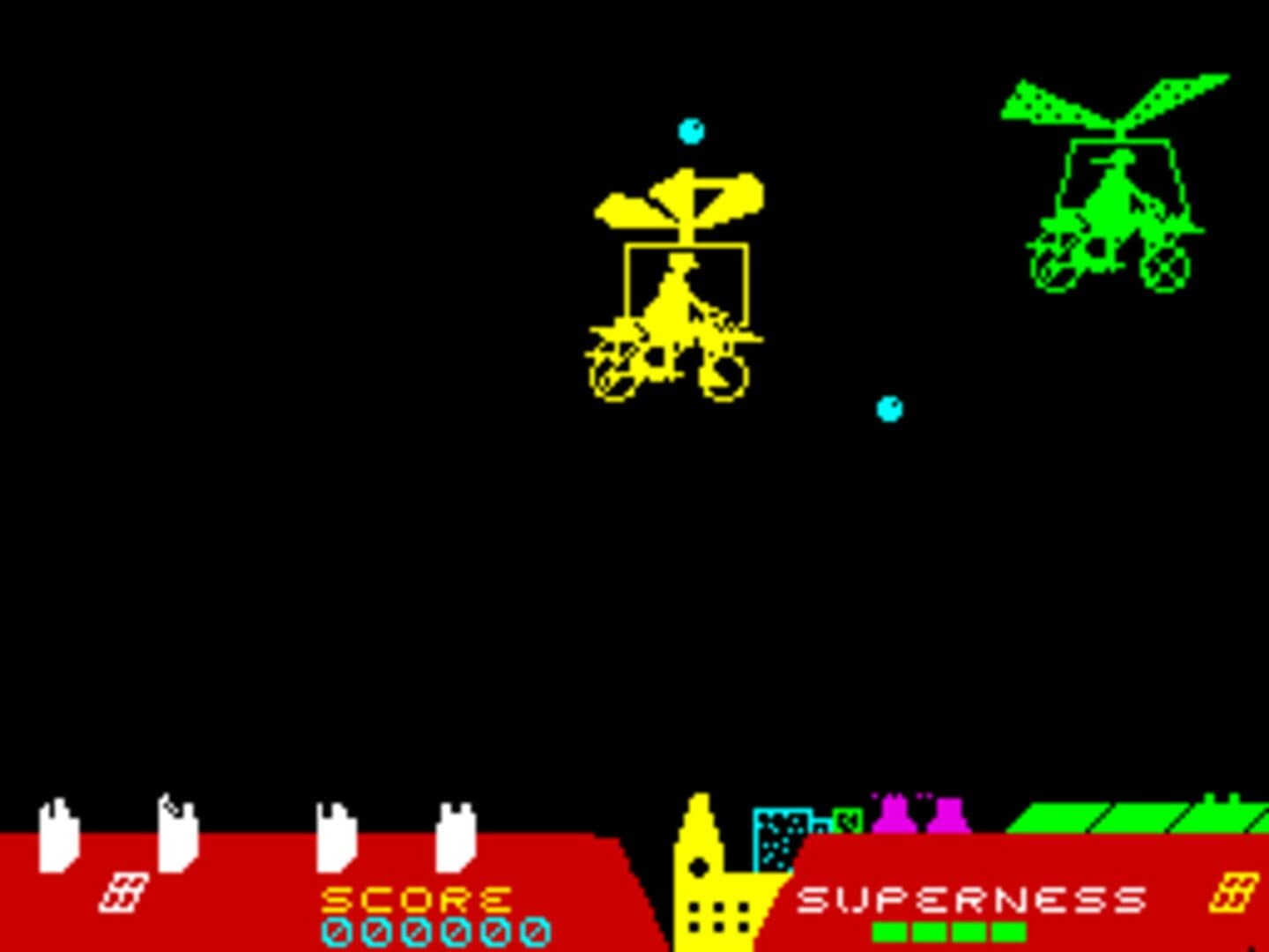 Super Gran is a game using the character from the 80s TV Show of the same name. You play as Super Gran and you must play eight levels with four different styles of games, as you attempt to thwart Scunner Campbell and his goons Tub and Rent-a-muscle. The first level sees you in a flying machine viewed from the side with the whole level shown on the screen. You must avoid and bomb the other flying machines and you complete the level when the timer reaches zero. The second level sees you with the ability to fly as yourself but with limited fuel which is viewed from the side but the game scrolls left or right when you move. You must avoid balloons and planes while you can collect any car or cat on the ground. There are fuel depots which will increase your fuel meter. The third level has you driving on a vertical scrolling road viewed from above as you must avoid the other car on the road and touching the sides. You can speed up or slow down. The fourth level is a platform game with the whole level shown on the screen. You must get to the top by jumping from various platforms while avoiding the bombs from a helicopter. Hitting a platform at the wrong angle also kills you and the tide slowly rises at the bottom. Once you have completed the four levels you then repeat them again. You have five lives and once they have gone it is game over. The joystick is used to control your hero with just one player playing the game. The C16 version has just three levels and misses out the second level where Super Gran flies.