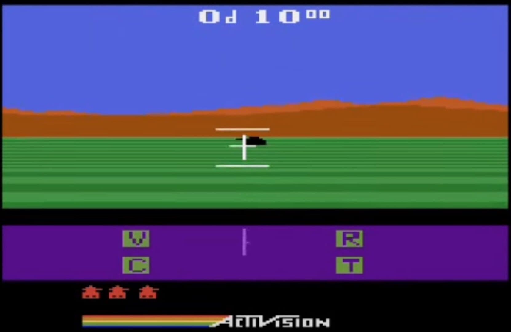 There are numerous enemy tanks crossing the countryside, destroying everything in their path! Your job is to command a robot tank to stop them. Robot Tank is a first person perspective arcade style action game. There are twelve squadrons of tanks to destroy, each containing twelve tanks. Each time you destroy a complete squadron, you earn an extra reserve tank before moving on to the next, more difficult squadron. The game takes place twenty four hours a day; gameplay will alternate from early morning to mid afternoon to late at night. In addition to the constantly changing time of day, the weather can also change unexpectedly. Snow, rain, and fog will appear occasionally making it tougher to spot your targets. Luckily your tank is equipped with radar to help locate the enemy when visibility is poor. As your tank takes damage you will lose some capabilites, such as speed, the radar, or your canons. If your tank takes too much damage, it will be destroyed; the game ends when all of your reserve tanks are gone.