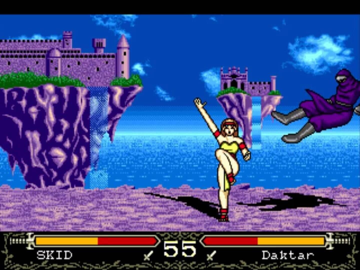 Revengers of Vengeance is a combination of RPG, vertical shooter, and fighting game with a fantasy/anime style. There are ten available characters, each with their own animated backstory and fighting techniques. You must choose a hero and guide their stats to create a formidable fighter capable of taking down the Devil King and freeing the land.