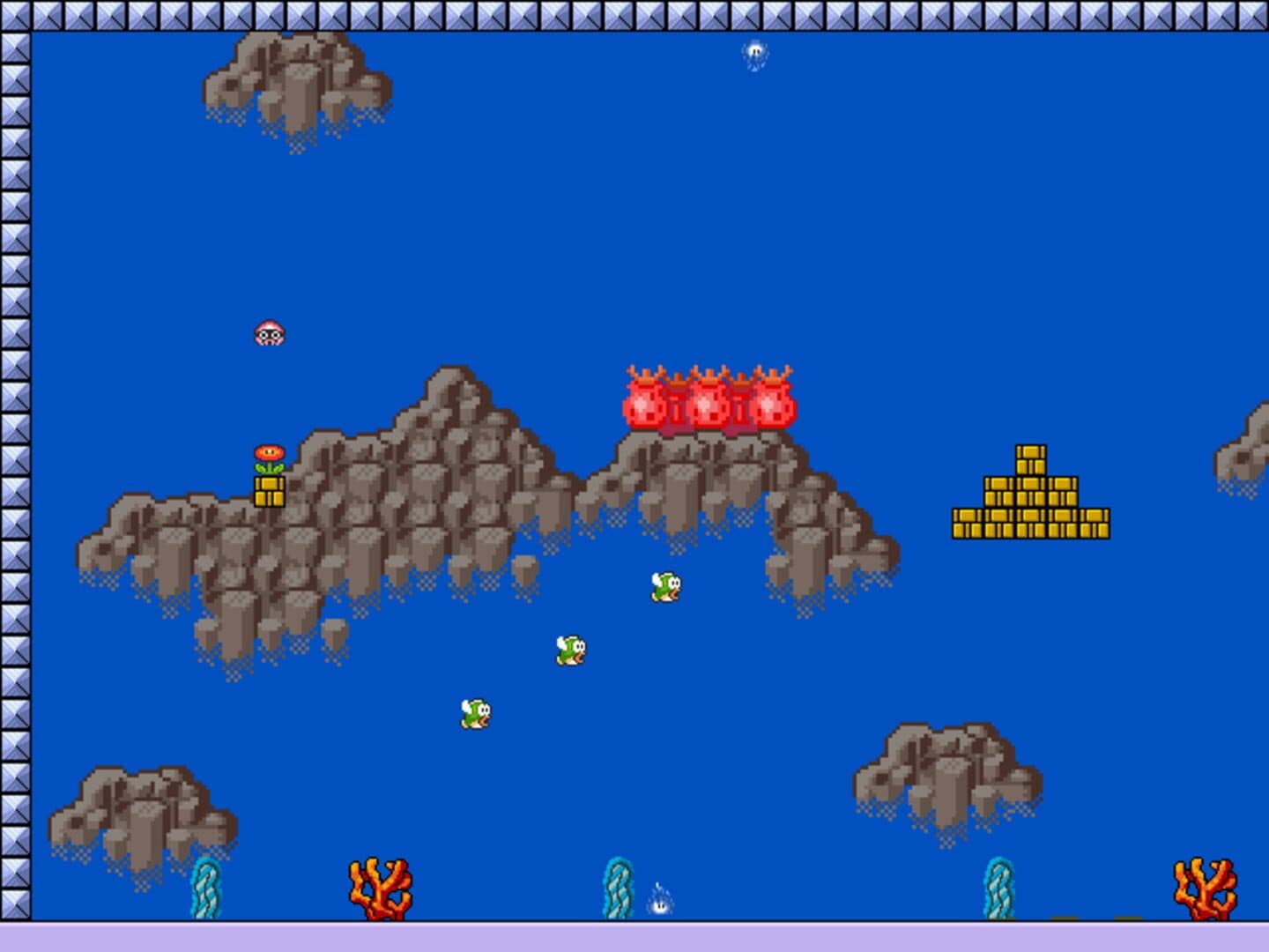 Blooper's Revenge is a platformer starring a Blooper created by Pyro. It is Pyro's first game, and consists of five worlds and a bonus world. Its events take place when Toads supposedly take over and pollute Blooper's homeland, and it must get it back.