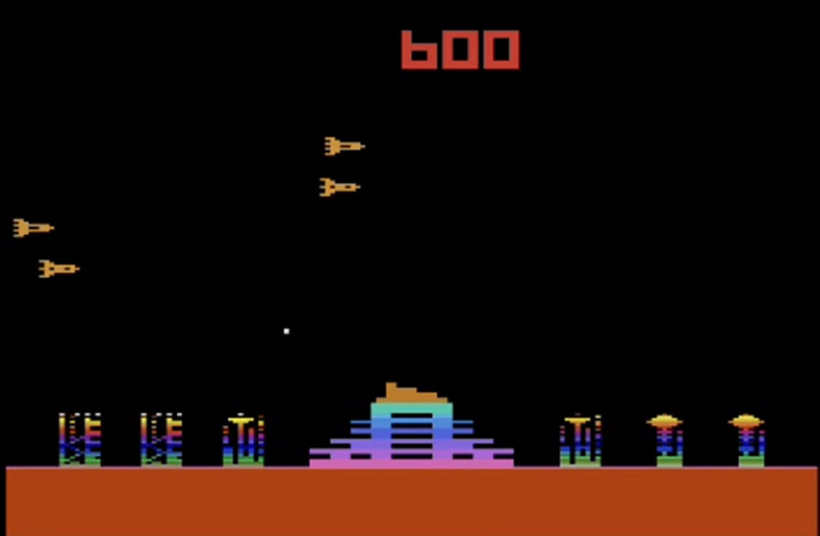 M.A.D. (which stands for Missile Attack and Defense) is an arcade action game somewhat similar to Missile Command. You control a photon cannon at the bottom of the screen, and your goal is to protect six energy stations located to your left and right. Waves of rockets and other ships will fly by on the screen, and occasionally one will drop in an attempt to destroy one of the stations (as a warning on most levels, the enemy will turn white just before it drops). You need to make sure you shoot it before your energy station is destroyed! When all six energy stations are gone, the game is over. A two player variation is also included; one player will control the photon cannon, and the second player controls a cursor and can select when and where an enemy will drop. The players alternate between offense and defense in this version.