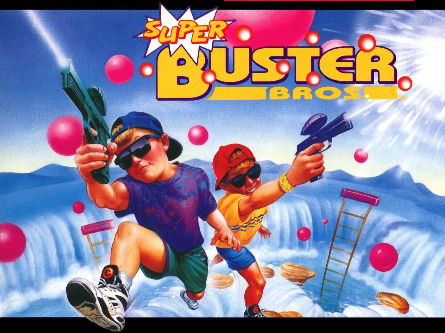 Super Pang is an adventure for one or two players that takes the player around the world, aiming to rid the planet of a terrible foe: seemingly innocuous-looking bubbles. The main portion of the game is Tour mode, where the player visits a series of different levels representing different countries of the world. Each player's character is armed with a gun, which shoots a vertical cable. If this hits a bubble, it will cause it to split in two. Upgrades allow two cables to be shot at once, or the ability to stick a cable to the ceiling where it will cling for a few seconds, bursting any bubble that hits it. Players must clear each screen of bubbles before progressing to the next one. The largest bubbles will have 4 degrees of splitting before clearing. Many level layouts have ladders, barriers and breakable bricks in part of the screen, affecting movement of both the player and the bubbles. Faster bubbles in the shape of diamonds also bounce around the screen going any which way rather than bouncing in predictable arcs like the other bubbles. Several power-up tokens are also available, offering features such as splitting all bubbles down to their minimal size, freezing the bubbles for a few seconds, and various different weapons. Monsters also enter the screen periodically, which hit the bubbles and take them down a size, and can often be directed by the cable weapon. In addition to the main Tour mode, the game also features Panic mode, in which a succession of bubbles are thrown at at the players. As the player progresses, the amount of bubbles required to reach the next level also increases, similar to scoring on Tetris.