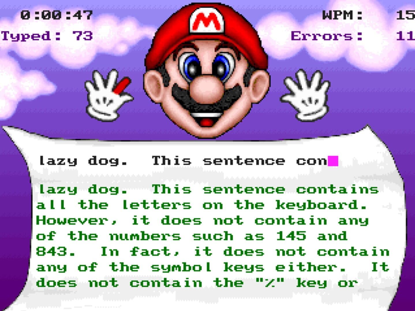 Mario Teaches Typing 2 is the sequel to Mario Teaches Typing. It includes several new features, including a certificate of achievement, a keyboard that is color-coded for easy reference, an on-screen keyboard, specially customizable lesson plans, and new levels. Additionally, Mario's face also makes small talk with the player throughout the levels. Many of Mario's face's antics in this game are cultural references. This is also the last educational Mario game to be released.