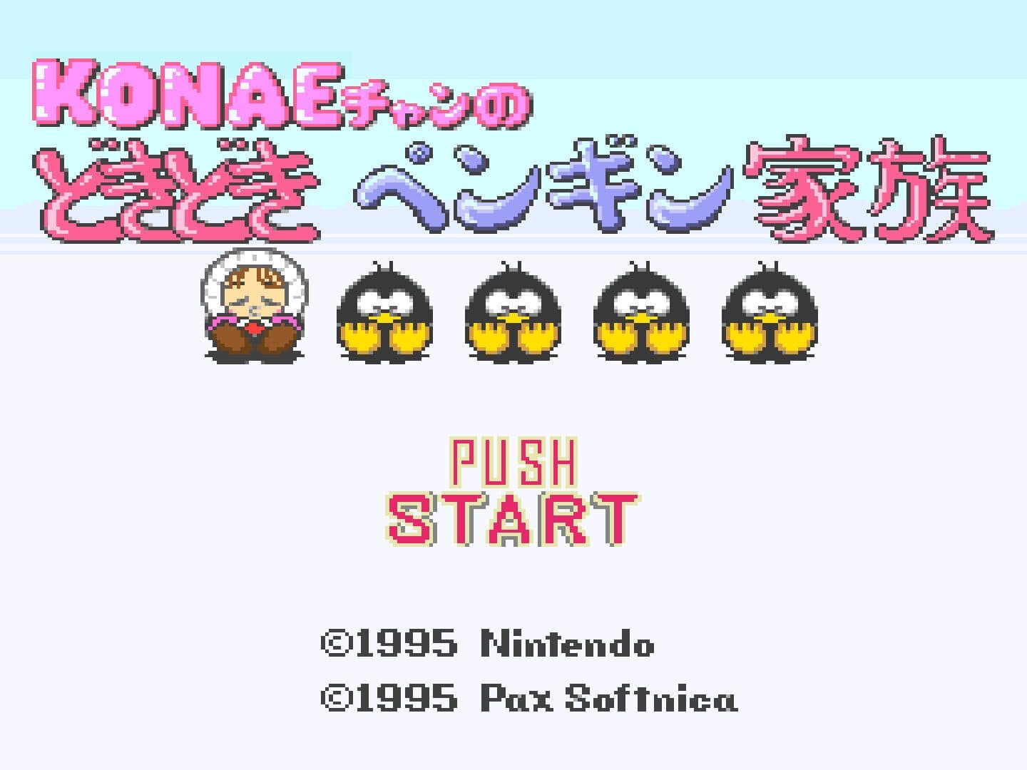 Konae-chan no DokiDoki Pengin Kazoku (KONAEちゃんのドキドキペンギン家族) is a Downloadable Event Game developed by Pax Softnica for the Satellaview. It stars Konae and was distributed as a tie in to the Radio Program "If Tomorrow Comes...". The premise of BS Konae-Chan no DokiDoki Pengin Kazoku is to cross a freezing body of water by jumping across rows of glaciers without falling into the water. Points are awarded based on the number of penguins collected.