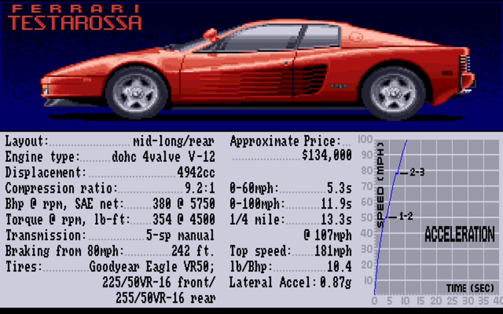 This addon for Test Drive II features 5 new cars which you can use to race the tracks. The cars include: '88 Lotus Turbo Esprit, Ferrari Testarossa, RUF CTR, '88 Lamborghini Countach 5000S and a '89 Corvette ZR1. As for every addon the main program is needed to enjoy the new cars.