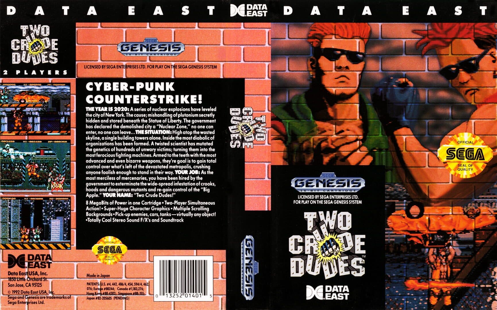 Two Crude Dudes is a 1991 beat 'em up arcade game produced by Data East. The game was later ported to the Sega Genesis in 1992. Outside Japan, the port was released under the name Two Crude Dudes. In Japan, the game was titled: Crude Buster. In the game, players control one of two mercenaries hired by the U.S. government to stop the terrorist organization "Big Valley". Their objective is to retake control of a ruined New York City from Big Valley after a nuclear explosion the group caused.