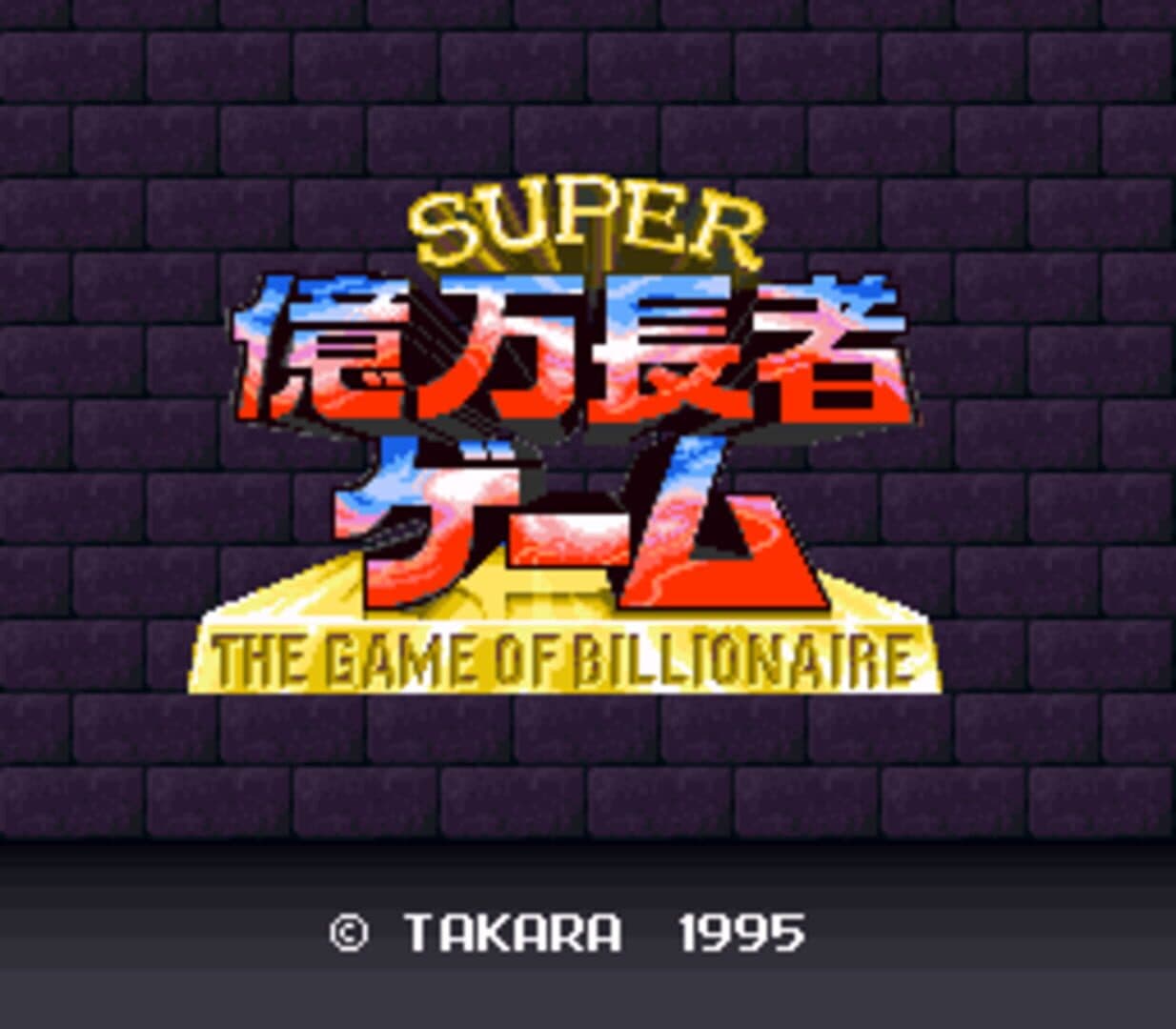 Super Okuman Chouja Game ("Super Billionaire Game") is a multiplayer virtual board game that concerns commerce and property development, not unlike Monopoly. On three separate maps - one based on the countries of the world, one based on a futuristic Tokyo and one on a historical Edo - the player moves across the board and buys and develops the various properties they land on. The goal is to make the most money and/or bankrupt the opponents. The game is the third in the Okuman Chouja series, though the only one to be released on the Super Famicom.