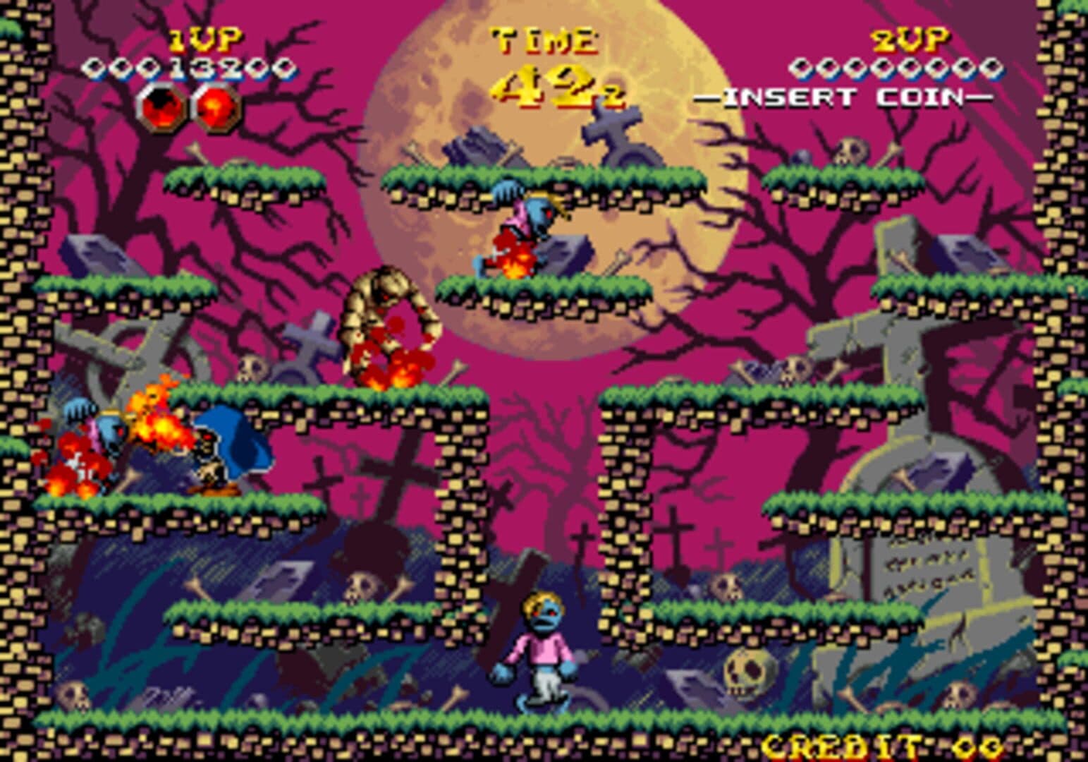 There lived one gravedigger at a very small village in a remote region. He lived a quiet, solitary life in a corner of the cemetery. He kept away from the village people due to his very ugly appearance. One day, he found the graves were ransacked and some corpses were stolen. He didn't want the village people to find out, so he decided to eliminate the grave burglars by himself. Thus, he patrolled the cemetery every night. A good ghoul goes around graveyards protecting them from evil doers. The player clears the area and collecting power ups using it to eliminate the enemies. There are five stages with five levels each, and each one of them has you throwing fireballs at ghouls, ghosts, goblins, and zombies. When you keep throwing fireballs at these enemies, they will ignite into a giant fireball, which you can throw at other enemies to kill them, and get the remaining treasure before moving on to the next level. At the end of the fifth level, a boss must be defeated in order to continue the game.