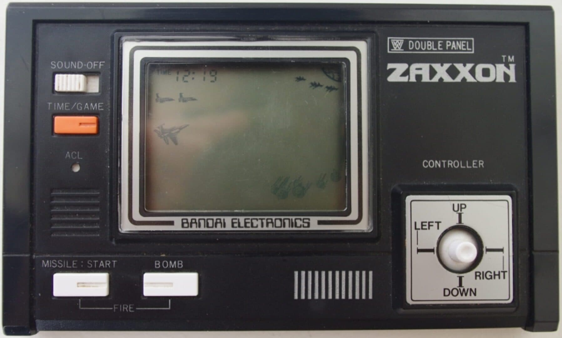 The handheld version of Zaxxon is a portable LCD game manufactured by Bandai with a license from Sega. It was released in 1982, and is based on the arcade game, Zaxxon. This system uses a "double panel" LCD screen, one to simulate the first section of the game (set in space) and another for one of the space stations. Aside from a similar perspective, handheld Zaxxon is very little like the arcade game - the player cannot move upwards or downwards, and many of the memorable scenery in the game (such as the brick walls and turrets) were omitted due to hardware restraints. In essance this turns Zaxxon into a fairly standard LCD shoot-'em-up game, where players move left and right shooting foes before being hit.